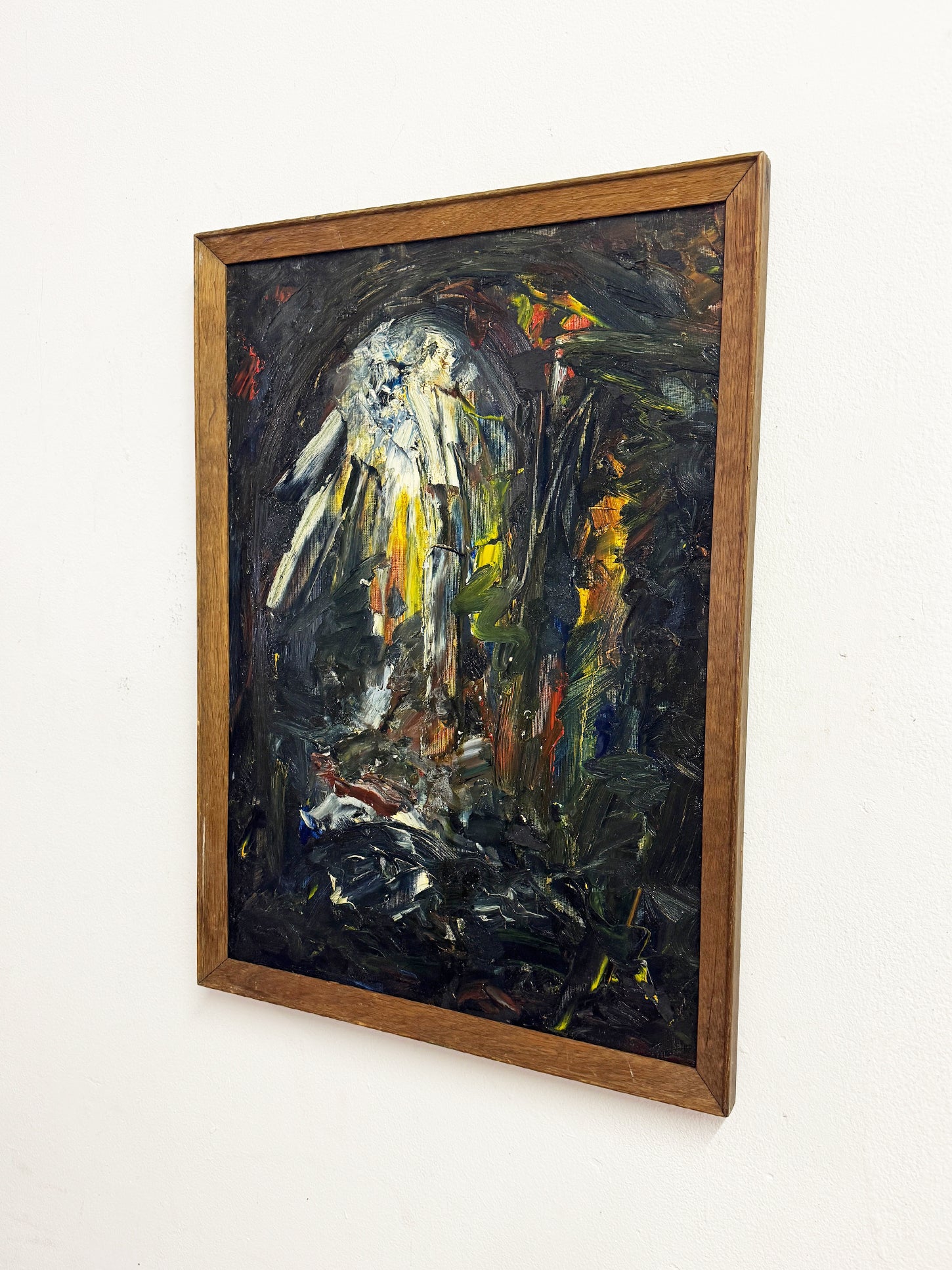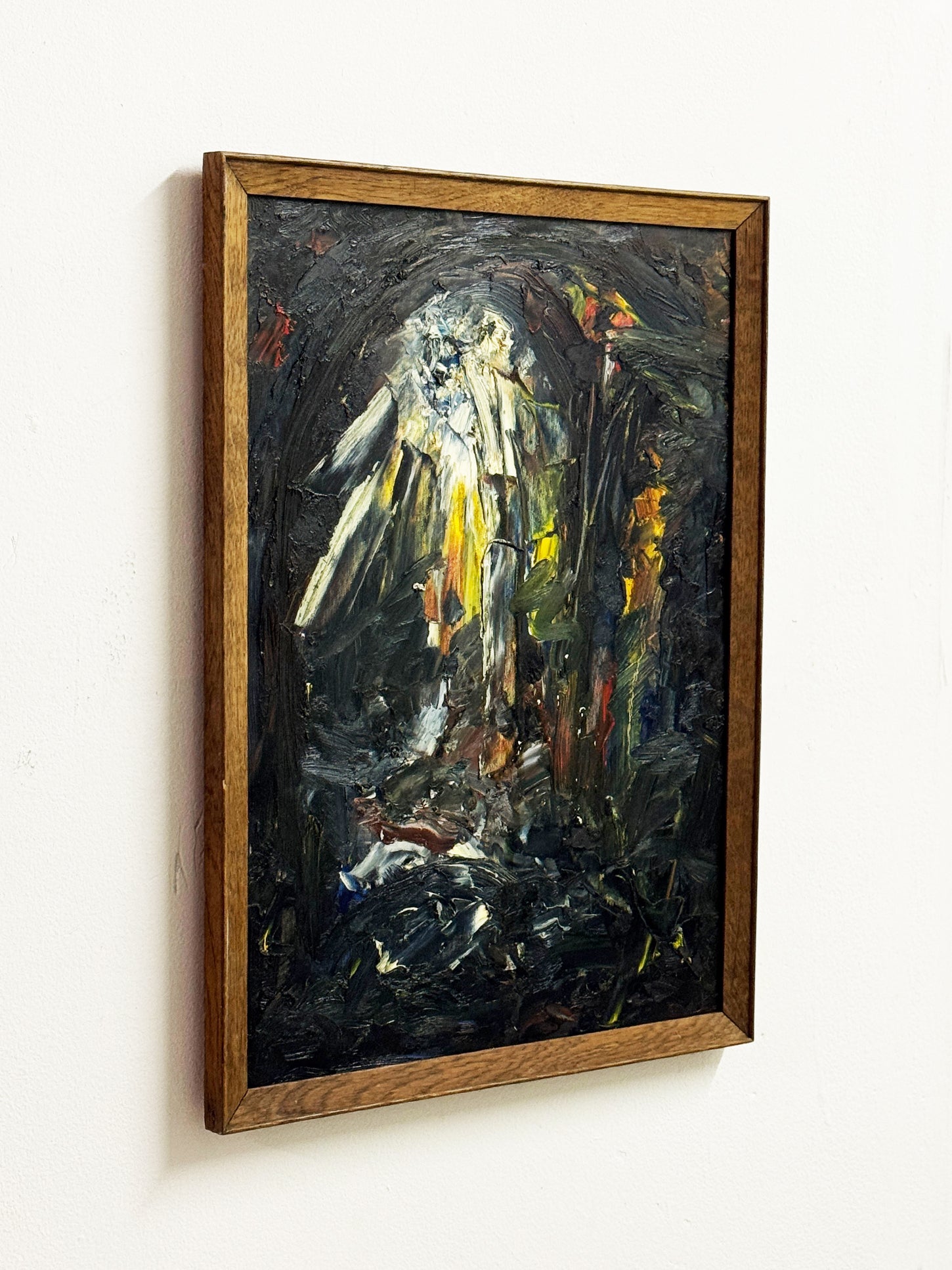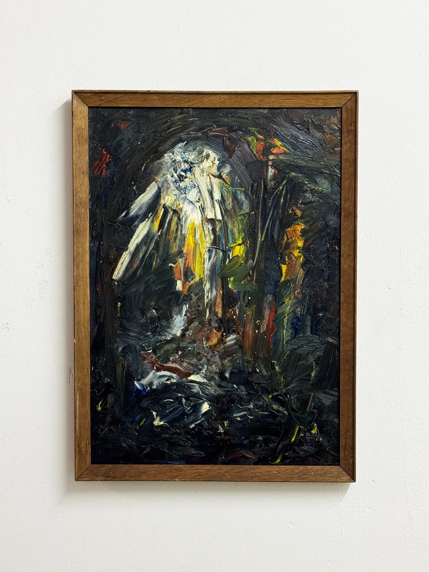 A striking mid-century abstract painting with a heavily worked surface and strong expressive presence. The composition is built around a central vertical form, surrounded by darker gestural passages, creating contrast, depth and a sense of atmosphere.
