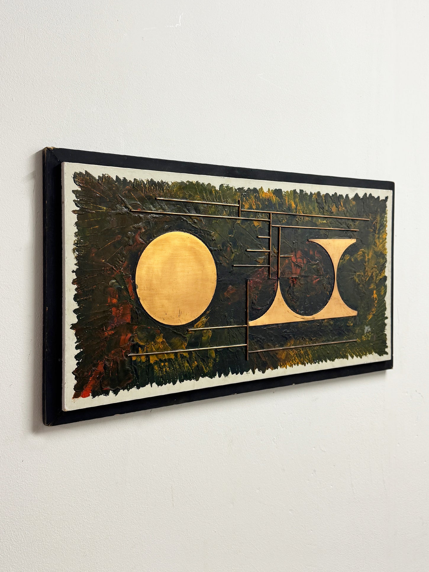 A striking Italian, signed and dated 1971 abstract mixed media wall panel featuring a bold geometric composition with applied copper elements. The design centres around circular forms and linear rods in relief, set against a richly textured painted ground of deep greens, ochres and burnt tones.