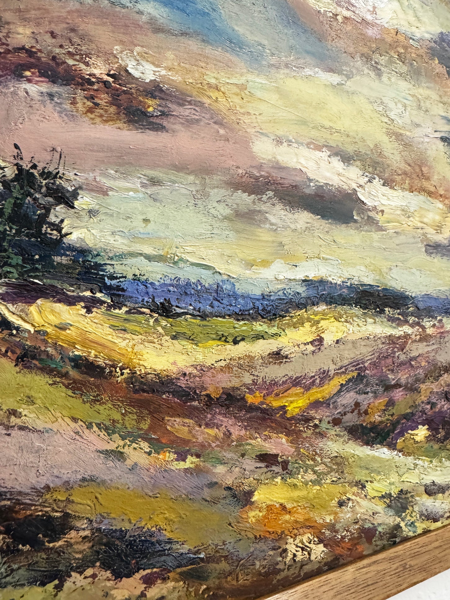 Bring warmth and character into your home with this stunning abstract landscape oil painting, featuring expressive brushstrokes and a rich palette of earthy yellows, deep purples, soft blues, and moody grays. The textured layers create movement and depth, capturing the beauty of an ever-changing sky over rolling fields. The work is indistinctly signed lower left.