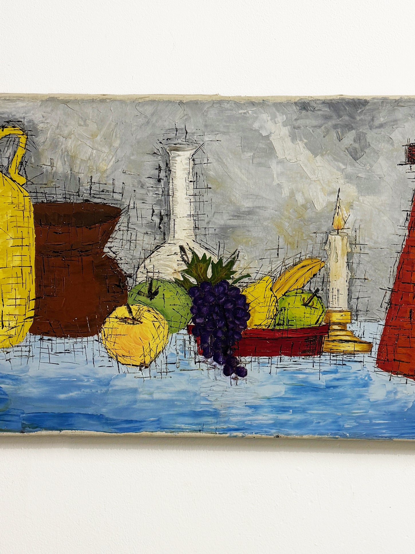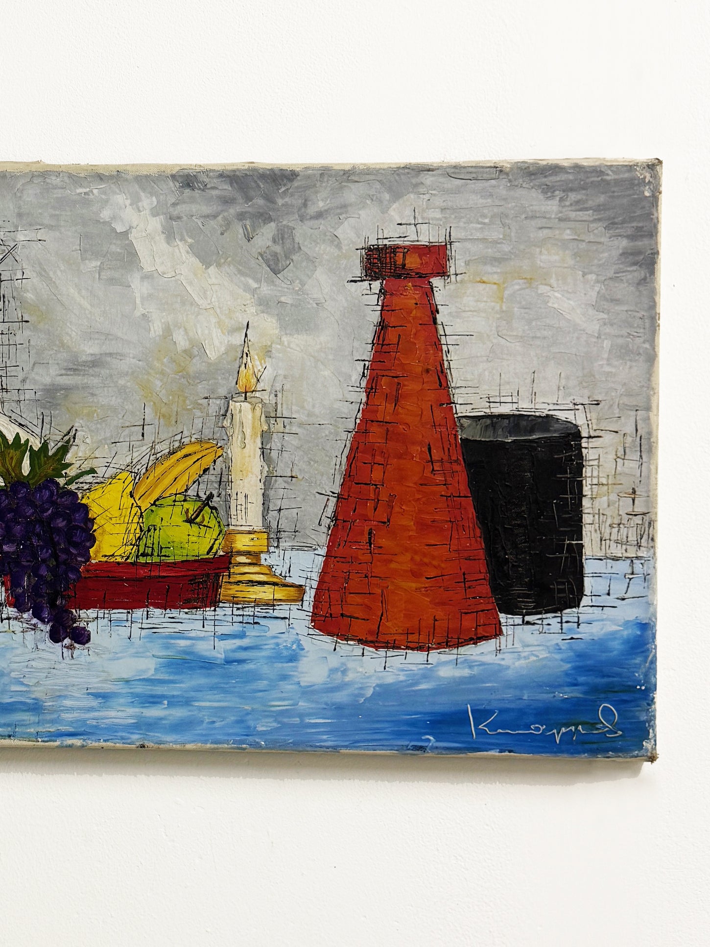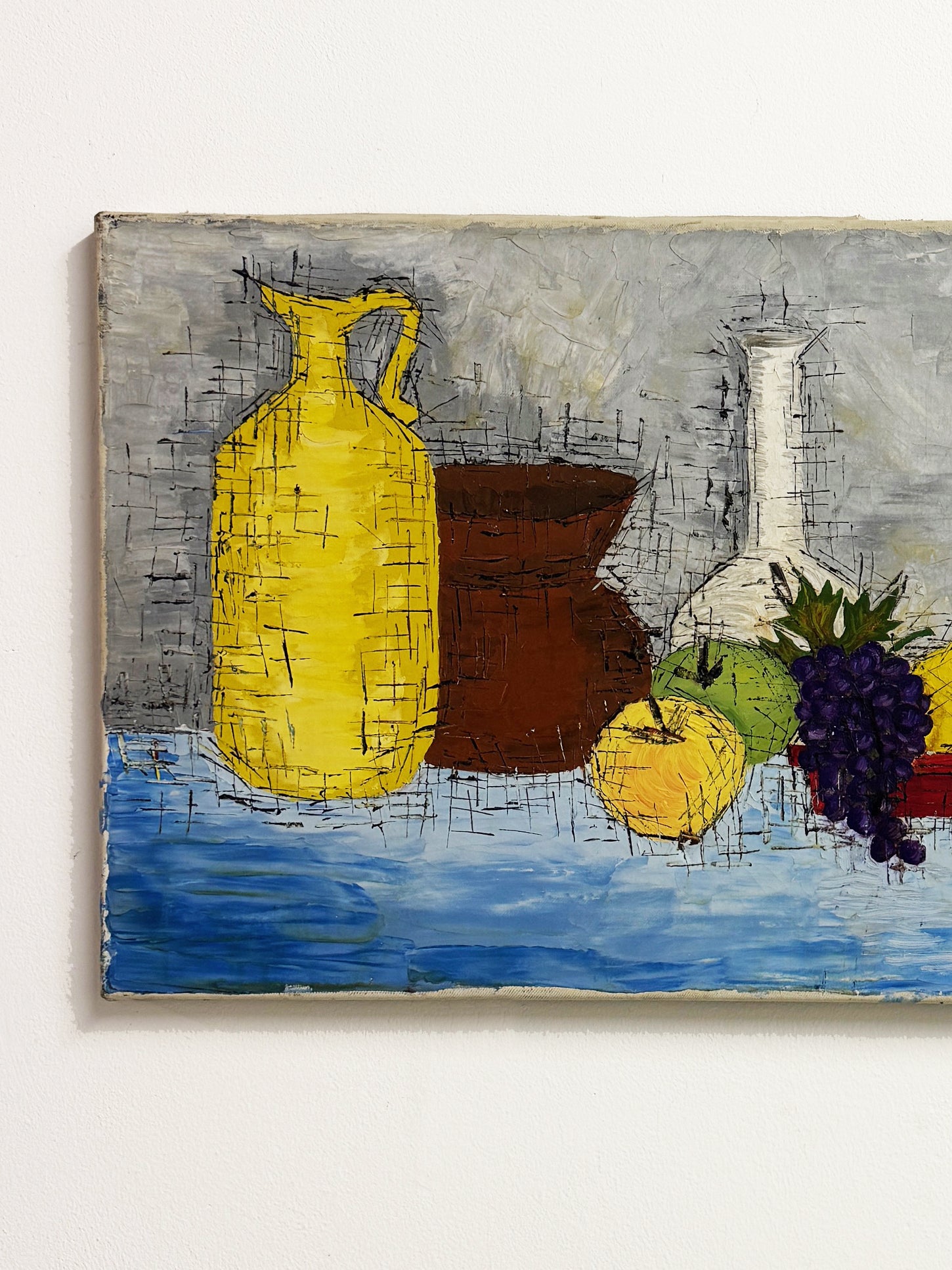 This mid century still life artwork features a bold arrangement of bottles and fruit arranged on a vivid blue tabletop. Painted with confident brushwork and textured layers in a European modernist style. The artist creates depth and energy through bold colour contrasts. Dynamic cross-hatched lines and geometric cubist forms give the piece a striking mid century aesthetic.