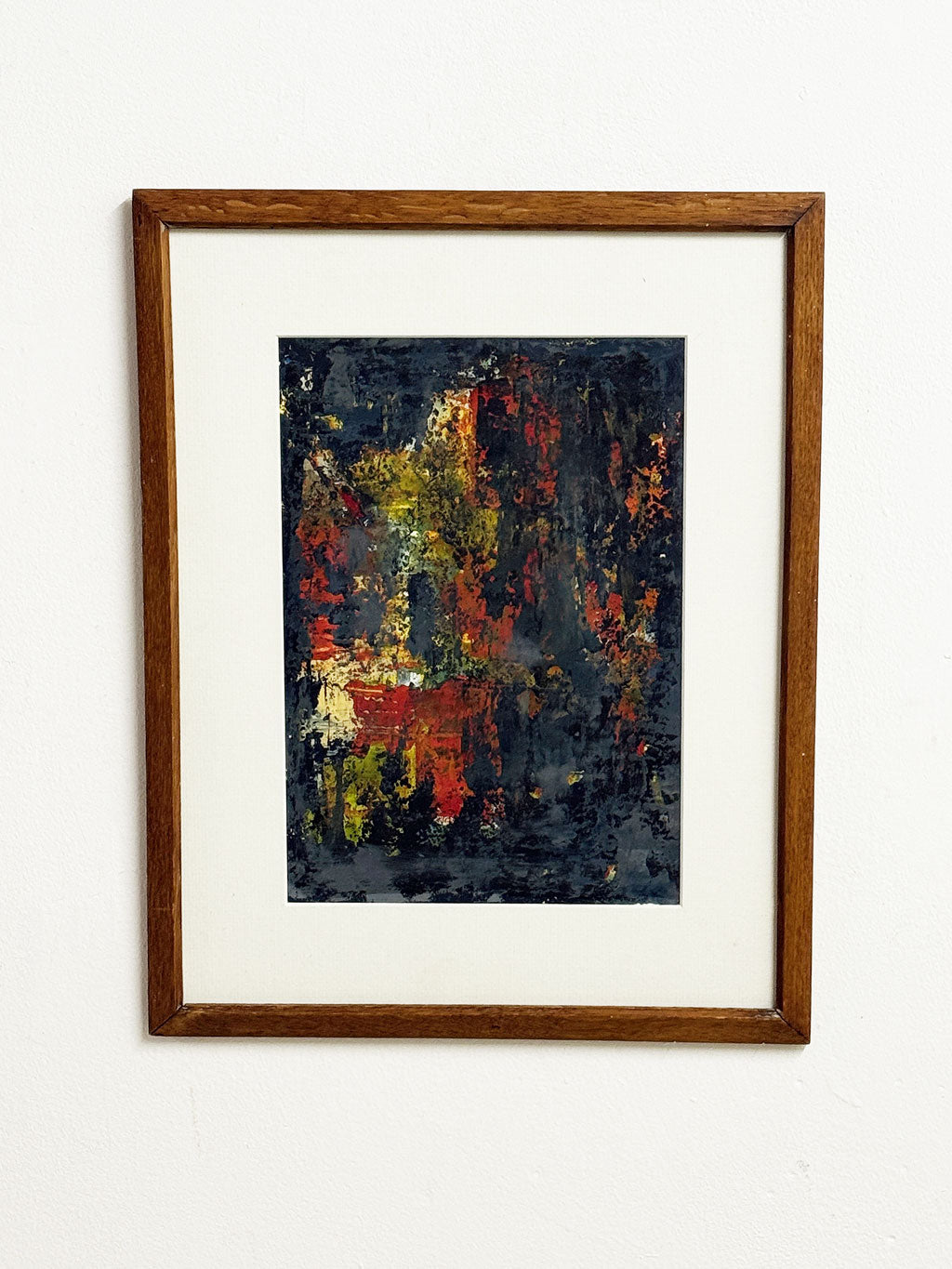 This original abstract painting features layered textures and expressive marks in deep charcoal tones accented with red, ochre, and subtle yellow highlights. The composition has depth and movement, creating visual interest that draws the eye without overpowering a space.